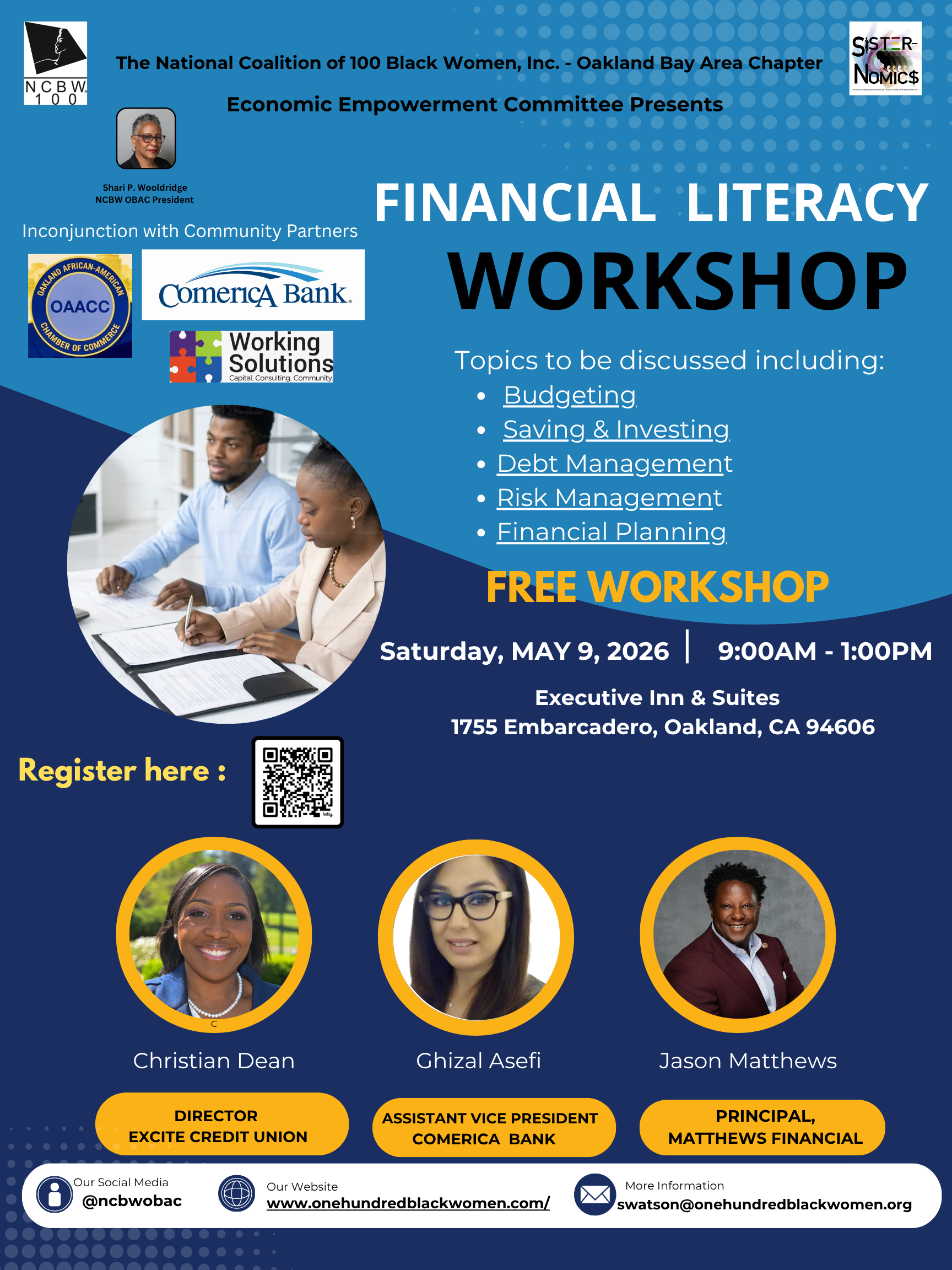 Thank you for agreeing to participate in this year's Financial Literacy Workshop! I have divided the workshop into 3 sections. I am not worried about you presenting everything listed in a linear fashion. How you touch on these components of financial literacy is up to you as long as we touch on them. Each presenter will have 40-45 minutes to present and there will be a Q & A session after. We will take a 15-20 minute break at about 11 am. Additionally, attached please find the event flyer for distribution to your networks.